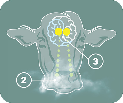 When applied to the skin above the muzzle, CattleZen’s pheromones are detected by the vomeronasal organ inside the nasal cavity — a key sensory organ that interprets chemical communication.